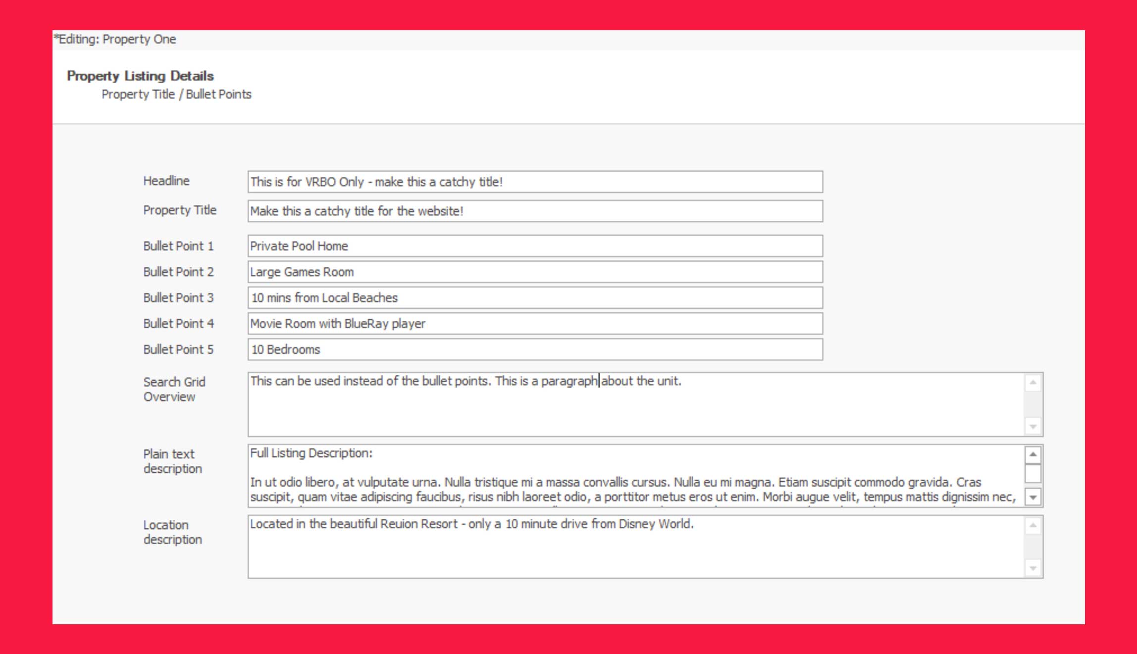 - Headline: This is for VRBO only. A catchy title.