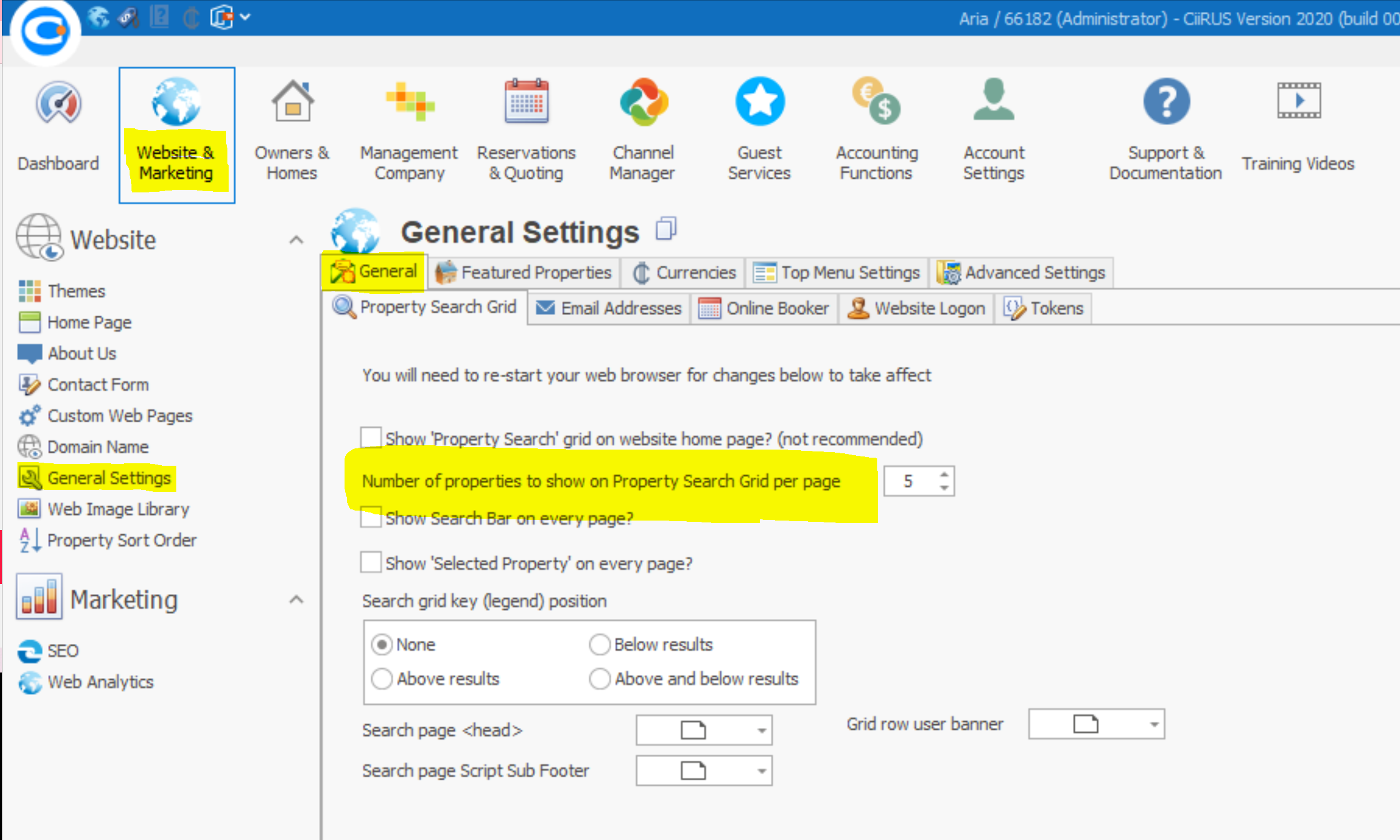 - Within the "Property Search Grid" tab, specify the number of units to display